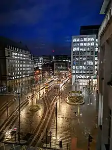 In the 1930s, the square was redeveloped around the construction of the Central Library and Town Hall Extension (1930–34). Plans for a rapid transit station in St Peter's Square were made in the 1970s; proposals for the abandoned Picc-Vic tunnel envisaged the construction of an underground station to serve both St Peter's and the neighbouring Albert Square.[2] The early proposals for an on-street light rail system in Manchester revived the idea of a station in the square, and the idea was retained as the project evolved, becoming a reality when the Metrolink system opened in 1992.