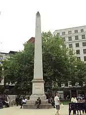 Six of the monuments have heritage listings, including one commemorating two men who died during the construction of Birmingham Town Hall and a memorial to the victims of the Birmingham pub bombings. Thomas Stirling Lee's statue of Charles Gore, vested in convocation robes with his right hand raised in blessing, is located at the West entrance. A large Portland stone obelisk commemorates Frederick Gustavus Burnaby. Besides Burnaby's bust, in relief, it carries only the word "Burnaby", and the dated place names "Khiva 1875" and "Abu Klea 1885". These refer to the Khanate of Khiva and Battle of Abu Klea, respectively; he was killed at the latter.[6] The obelisk was unveiled by Lord Charles Beresford on 13 November 1885.[7] An earlier red marble was erected in 1857 to commemorate the life and death of Lieutenant-Colonel Thomas Unett, who died leading his men during the Siege of Sevastopol.[8] Upon completion of the Burnaby building, it was decided to prohibit monuments from being added to the interior.[2]