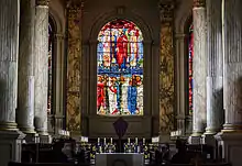The original shallow eastern apse was extended in 1884–88 by J. A. Chatwin into a much larger chancel,[4] articulated by strongly projecting Corinthian columns. This bold design is made richer by the marbled surfaces of the columns and pilasters, the gilding of capitals and cornice and the ornately coffered ceiling. Chatwin also refaced the exterior of the building because the stone from the original quarry was very soft.[4] The tower was refaced in 1958-59.