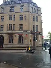 On 10 February 1355—Saint Scholastica Day—several university students went for a drink at the Swindlestock Tavern.[24] The tavern was located in the centre of Oxford, on the corner of St Aldate's and Queen Street, at Carfax; the tavern was a regular drinking spot for the students.[25] Two of the group were Walter de Spryngeheuse and Roger de Chesterfield,[lower-alpha 5] beneficed clergymen from South West England;[27] de Spryngeheuse was the former rector of Hamden, Somerset.[28] They were served wine by John de Croydon, who was the tavern's vintner[29] or possibly the landlord,[30] although the scholar Louis Brewer Hall and the antiquarian Anthony Wood, among others, describe him as a friend of John de Bereford, who was the tavern's owner and the mayor of Oxford.[28][31][32] De Spryngeheuse and de Chesterfield complained to de Croydon that the wine was sub-standard and asked that they be served a better drink.[25][lower-alpha 6] De Croydon refused to listen to the complaints and, according to Wood, "several snappish words passed" between the men before de Croydon gave them "stubborn and saucy language".[24] As a result de Chesterfield threw his drink in de Croydon's face.[33] Sources differ on what happened next: according to those sympathetic to the university, de Chesterfield threw his wooden drinking vessel at de Croydon's head; those sympathetic to the townsfolk say the student beat him around the head with the pot.[25] A petition by the town authorities to Parliament said the students "threw the said wine in the face of John Croidon, taverner, and then with the said quart pot beat the said John".[13]