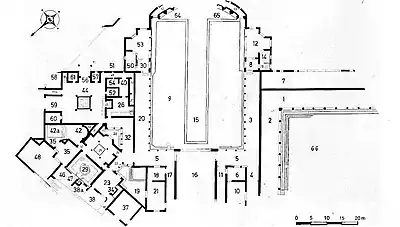 The part of the villa shown in red was excavated in 1762 while the rest was done in 1781.[59] It was centred around a peristyle and an olive mill was found in the torcularium.[60] Several agricultural implements were found including hoes, a hammer and amphorae.