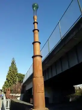 The sculpture, designed by Ean Eldred and Rigga and completed in 2001, was funded by the City of Portland Development Commission's Percent for Art program. It is one of four by Rigga along the esplanade; the others are Alluvial Wall by Peter Nylen, Echo Gate by Eldred and Ghost Ship by James Harrison.[1] Stack Stalk is composed of mild steel, stainless steel, glass float and electric light, and measures 25 feet (7.6 m) x 2 feet (0.61 m) x 2 feet (0.61 m). The abstract lamp post contains graduated cylinders stacked to support the glass float.[2] cultureNOW describes it as "Part smoke stack, part sheaf of wheat... a beacon holding a Japanese glass fishing float from the coast up to the sky."[3]