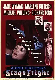 Stage Fright is a 1950 American-British film noir directed and produced by Alfred Hitchcock and starring Jane Wyman, Marlene Dietrich, Michael Wilding and Richard Todd. Others in the cast include Alastair Sim, Sybil Thorndike, Kay Walsh, Hitchcock's daughter Pat Hitchcock in her movie debut, and Joyce Grenfell in a humorous vignette.