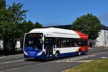 ![]() An Alexander Dennis Enviro 400 MMC, branded in the company's former corporate livery, seen at Gallowgate in Newcastle upon Tyne. | |