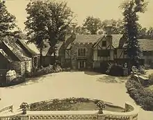 Built in the late 1920s by architect Perry Barker, the Bendel Mansion was Henri Willis Bendel’s homage to the classical elegance of a British manor house. Using two Tudor mansions located in Maidenhead, England as inspiration, Barker built the epitome of the American "castle" of the time for his client. The house is on a hill overlooking the lake and has lead-framed glass windows, half-timbered walls, gargoyles, arching staircases, slate roofs, and multiple chimneys.[1] Today, the Bendel Mansion functions as a gallery and museum space and is open to the public.