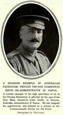 Miles Staniforth Cater Smith, MBE (25 February 1869 – 14 January 1934) was an Australian politician. Born in Kingston, Victoria, to William John Smith and Margaret Gomersall (Charlesworth), he was educated at St Arnaud Grammar School and then the University of Melbourne before becoming an engineer.