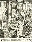 Making the Gate (1948) depicts Rupert Timms who was born 1912 in Aston Clinton near Thame. He came from a long line of farriers and worked with his father Ralph until Ralph's death in 1960. Work for the Timms began to decline after World War Two so in 1947 they entered a competition for blacksmiths run by the Royal Agricultural Society of England who aimed to revive rural crafts. The task was to create a wrought iron gate. The Timms built the gate to a design by Anderson and won first prize in the competition which was held at the 1947 Royal Show at Oxford. They won again at York in 1948. The engraving shows Rupert Timms making the gate with Anderson's design pinned up on the wall behind him. The Timms developed a business as ornamental blacksmiths based on Anderson's original design and they made gates St. Mary's Church, Thame, and Elm Park Recreation Ground, also in Thame.[11]