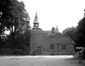 Gordon's scheme met with some local opposition and he was forced to re-route the railway line further east to mitigate objections. The site for a terminus was selected in Old Church Lane in Stanmore. To allay the concerns of the local inhabitants — and to appeal to his well-heeled customers — Gordon commissioned an architect to design an elegant station building that resembled a Gothic-style English country church.[1] The Stanmore branch line opened to great fanfare on 18 December 1890.[2]