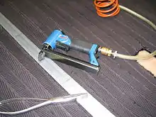 A staple gun or powered stapler is a hand-held machine used to drive heavy metal staples into wood, plastic, or masonry. Staple guns are used for many different applications and to affix a variety of materials, including insulation, house wrap, roofing, wiring, carpeting, upholstery, and hobby and craft materials. These devices are also known as trigger tackers.[1]