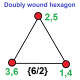 If p and q are not coprime, a degenerate polygon will result with coinciding vertices and edges. For example {6/2} will appear as a triangle, but can be labeled with two sets of vertices 1-6. This should be seen not as two overlapping triangles, but a double-winding of a single unicursal hexagon.[6][7]