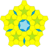 These polygons are often seen in tiling patterns. The parametric angle α (degrees or radians) can be chosen to match internal angles of neighboring polygons in a tessellation pattern. Johannes Kepler in his 1619 work Harmonices Mundi, including among other period tilings, nonperiodic tilings like that three regular pentagons, and a regular star pentagon (5.5.5.5/2) can fit around a vertex, and related to modern penrose tilings.[8]
