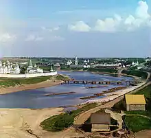 The town was established in 1297 under the name of Gorodok (Городо́к), lit. small town).[3] In 1365, it was moved from the more elevated right to the lower left bank of the Volga River. Since the 15th century, the town has been called Staritsa (lit. former river-bed). The name was misinterpreted by heraldists who represented on Staritsa's coat of arms an image of aged nun, which is another meaning of the Russian word "staritsa". In the 14th century, it belonged to the Principality of Zubtsov, which was eventually was merged back into the Principlality of Tver. In 1485 it was formally annexed by the Grand Duchy of Moscow. The Golden Age of the town began. Between 1519 and 1597 the Principality of Staritsa, subordinate to Moscow, existed with the capital in Staritsa.[3] The principality was ruled by Ivan III's son Andrey, and then by Andrey's son Vladimir. While Ivan the Terrible had no children, Vladimir was regarded by boyars as his only heir. As the Tsar suspected Staritsa's ruler of plotting against him, Vladimir and his children were forced to take poison. The opulence of Staritsa during Vladimir's reign can be seen in the Dormition Monastery.
