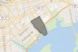 In 1962, a California-based investment group purchased 130 acres (53 ha) of land along Pennsylvania Avenue between Flatlands Avenue and the Belt Parkway, intending to construct apartments on the property. The Thompson–Starrett Co. was retained to construct the buildings.[38] In March 1964, the investment group applied to the New York State Housing Finance Agency for a mortgage worth $145 million towards the development. At the time, the site was referred to as part of Canarsie.[39] On December 1, 1964, the State Housing Finance Agency announced a project called Park Shore Village, which would construct a middle-income apartment complex on the site.[40] The complex would consist of 19 buildings standing 11, 17 and 21 stories high. It would also include a 40-acre (16 ha) shopping center, community center, swimming pools, and a skating rink, along with a new elementary school (PS 346) and parking for residents.[40] Funds would be provided by loans under the Mitchell-Lama Housing Program.[40][41] The development would be built in two phases, eventually housing 25,000 people.[40][41][42] The project was approved by the New York City Planning Commission on January 20, 1965,[41] and by the New York City Board of Estimate on February 11, 1965.[43] Construction on the first phase was projected to start in the spring of that year and be complete by 1967, at which point the second phase would begin.[42] However, the original investment group withdrew due to financial concerns and the project did not commence.[44]