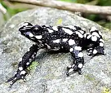 The starry night toad (Atelopus arsyecue) is a species of toad in the family Bufonidae endemic to the Sierra Nevada de Santa Marta, Colombia.[2] Its natural habitats are sub-Andean and Andean forests, sub-páramo and páramo at 2,000–3,500 m (6,600–11,500 ft) above sea level. Reproduction takes place in fast-flowing rivers. It is named after its unique coloration, being largely black with white spots.[3]