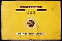 State Express 555, simply known as 555, is a British brand of cigarette originally manufactured in the United Kingdom by the Ardath Tobacco Company. The overseas rights to the brand, excluding the U.K., were acquired by British American Tobacco (BAT) in 1925.[1] It was sold widely throughout the world.[2] Today, the brand is still very popular in Asia, especially in the Greater China area, Vietnam, and Cambodia. In the United Kingdom, they are registered and manufactured in Westminster, City of Westminster, London.