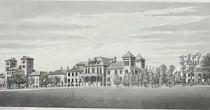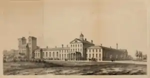 The institution was built to accommodate 300 students, with apartments for the superintendent and his family; rooms for other persons employed; a chapel; hospital, offices, 7 "solitaire dormitories" for disciplined, school rooms, workshops and sleeping dormitories. The foundations of the building were built with stones, the walls were brick and the roof was slated.[5][note 4][note 5]