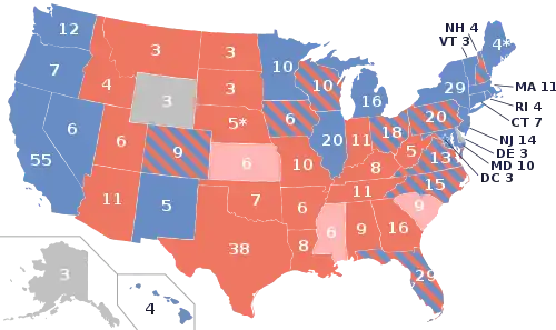 (270 electoral votes needed to win) * 2 of Maine's congressional electoral votes and 2 of Nebraska's congressional electoral votes have not been polled. | |||