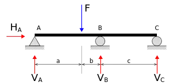 In the beam construction on the right, the four unknown reactions are VA, VB, VC, and HA. The equilibrium equations are:[2]