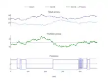 Historically, StatArb evolved out of the simpler pairs trade[2] strategy, in which stocks are put into pairs by fundamental or market-based similarities. When one stock in a pair outperforms the other, the under performing stock is bought long and the outperforming stock is sold short with the expectation that under performing stock will climb towards its outperforming partner. Mathematically speaking, the strategy is to find a pair of stocks with high correlation, cointegration, or other common factor characteristics. Various statistical tools have been used in the context of pairs trading ranging from simple distance-based approaches to more complex tools such as cointegration and copula concepts.[3]