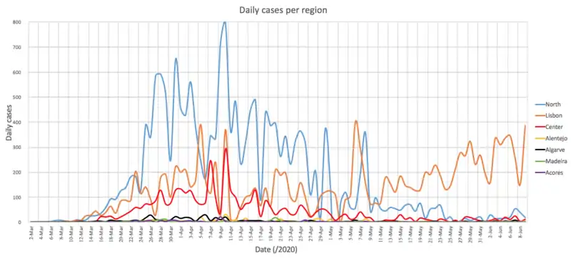 The following graph shows the daily cases of COVID-19 for each region of Portugal (updated on the 10th of June) according to DGS[14] visualising the table above.