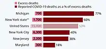 Excess mortality[8] comparing deaths for all causes versus the seasonal average is more reliable.[9] It counts additional deaths which are not explained by official reported coronavirus mortality statistics.[10] The CDC says it will issue an official estimate of coronavirus deaths in 2021—current estimates may not be reliable.[4]
