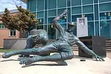 In September 2015, as the Atlanta Braves were preparing to move from Turner Field to SunTrust Park, WXIA-TV reported that the statue of Cobb was not included in the list of items the Braves intended to bring with them to the new stadium.[4] It was the only statue the Braves were not planning to relocate with them.[5] The Braves stated that the reason for this was that the statue was owned by the Atlanta–Fulton County Recreation Authority and not the team.[6] However, several sources alleged that the decision was due in part to Cobb's reputation, particularly with regards to race.[5][7] While both the Recreation Authority and Georgia State University initially claimed the statue as their own, the statue was ultimately gifted to the Cobb's hometown of Royston, Georgia,[2] where it was dedicated on May 21, 2017 in front of the Royston Public Library.[8] In December, a large folk art painting of the statue's rededication was unveiled at the Ty Cobb Museum, also located in Royston.[9][10]