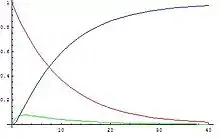 If the rate constants for the following reaction are and ; , combining the rate equations with a mass balance for the system yields three coupled differential equations: