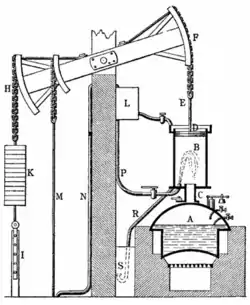 The first practical mechanical steam engine was introduced by Thomas Newcomen in 1712. Newcomen apparently conceived his machine quite independently of Savery, but as the latter had taken out a very wide-ranging patent, Newcomen and his associates were obliged to come to an arrangement with him, marketing the engine until 1733 under a joint patent.[2] Newcomen's engine appears to have been based on Papin's experiments carried out 30 years earlier, and employed a piston and cylinder, one end of which was open to the atmosphere above the piston. Steam just above atmospheric pressure (all that the boiler could stand) was introduced into the lower half of the cylinder beneath the piston during the gravity-induced upstroke; the steam was then condensed by a jet of cold water injected into the steam space to produce a partial vacuum; the pressure differential between the atmosphere and the vacuum on either side of the piston displaced it downwards into the cylinder, raising the opposite end of a rocking beam to which was attached a gang of gravity-actuated reciprocating force pumps housed in the mineshaft. The engine's downward power stroke raised the pump, priming it and preparing the pumping stroke. At first the phases were controlled by hand, but within ten years an escapement mechanism had been devised worked by of a vertical plug tree suspended from the rocking beam which rendered the engine self-acting.