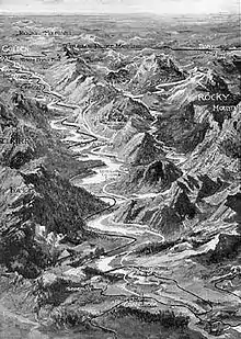 Once in the United States, the Kootenay river, in its natural state before the construction of the Libby Dam, flowed through Jennings Canyon to the settlement of Jennings, Montana. Jennings has almost completely disappeared as a town, but it was near Libby, Montana. Above Jennings, the Kootenay River narrowed as it ran through Jennings Canyon, which was a significant hazard to any river navigation.[22] A particularly dangerous stretch was known as the Elbow. Jennings Canyon was described by Professor Lyman as "a strip of water, foaming-white, downhill almost as on a steep roof, hardly wider than steamboat".[23]