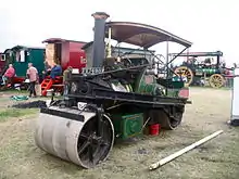 The majority of rollers were of the same basic 3-roll configuration, gear-driven, with two large smooth wheels (rolls) at the back and a single wide roll at the front. (Actually, the wide roll usually comprised two narrower rolls on the same axle, to make steering easier.) However, there was also a distinctive variant, the "tandem", which had two wide rolls, one front, one rear. Those made by Robey & Co. used their standard steam wagon engine and pistol boiler fitted in a girder frame with rolls and a chain drive to produce a quick-reversing roller suitable for modern road surfaces such as tarmacadam and bituminous asphalt.[4] A number of Robey & Co. tandem rollers were modified to make a further variant, the tri-tandem, which was a tandem with a third roll, mounted directly behind the rear one. Robey supplied the parts, but the modification was undertaken by Goodes of Royston.[4] Ten tandem and two tri-tandem Robey rollers survive in preservation,[5] and one of the tri-tandems is known to have been used to construct parts of the M1 motorway.