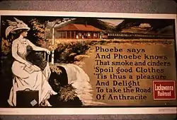 The site they were referring to had belonged to the DL&W. On the property were 13 buildings, built between 1865 and 1937 and all listed on the National Register of Historic Places.[3] DL&W owned the route of the Phoebe Snow. Phoebe Snow was the name of a fictional character in an advertisement for the DL&W's use of clean-burning anthracite coal. She was a young woman who frequently rode the DL&W, always dressed in white. There was never any soot on Phoebe Snow's white dress as the DL&W traveled its route from Hoboken, New Jersey, to Buffalo.[40] The DL&W merged with the Erie Railroad in 1960 to form the Erie Lackawanna Railway and "kept the Phoebe Snow name alive even after it converted to diesel locomotives in the 1950s."[40] Later, some of the trains that ran on the DL&W became known individually as the Phoebe Snow. The railroad passed to Conrail, and the site was eventually bought from them by the city of Scranton as the site for Steamtown, USA. According to Linda Greenhouse of The New York Times, "Scranton was once served by five railroads, an almost unthinkable luxury for a city of just over 80,000 people. The passenger trains stopped decades ago, but one memory remains: the Lackawanna's elegant station, just up the street from Steamtown, completed in 1908 and converted into a hotel through a public-private partnership in 1983."[40]