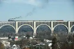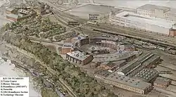 Steamtown National Historic Site (NHS) is a railroad museum and heritage railroad located on 62.48 acres (25.3 ha)[2] in downtown Scranton, Pennsylvania, at the site of the former Scranton yards of the Delaware, Lackawanna and Western Railroad (DL&W). The museum is built around a working turntable and a roundhouse that are largely replications of the original DL&W facilities; the roundhouse, for example, was reconstructed from remnants of a 1932 structure. The site also features several original outbuildings dated between 1899 and 1902. All the buildings on the site are listed with the National Register of Historic Places as part of the Delaware, Lackawanna and Western Railroad Yard-Dickson Manufacturing Co. Site.[3][4]