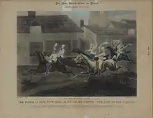 The steeplechase originated in Ireland in the 18th century as an analogue to cross-country thoroughbred horse races which went from church steeple to church steeple, hence "steeplechase". The first steeplechase is said to have been the result of a wager in 1752 between Cornelius O'Callaghan and Edmund Blake, racing four miles (6.4 km) cross-country from St John's Church in Buttevant to St Mary's Church (Church of Ireland) in Doneraile, in Cork, Ireland.[1] An account of the race was believed to have been in the library of the O'Briens of Dromoland Castle. Most of the earlier steeplechases were contested cross-country rather than on a track, and resembled English cross country as it exists today. The first recorded steeplechase over a prepared track with fences was run at Bedford in 1810, although a race had been run at Newmarket in 1794 over a mile (1600 m) with five-foot (1.5 m) bars every quarter mile (400 m).[2] and the first recorded steeplechase of any kind in England took place in Leicestershire in 1792, when three horses raced the eight miles from Barkby Holt to Billesdon Coplow and back.[3]