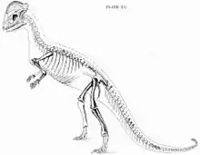 In 1924, the American palaeontologist Charles W. Gilmore described a complete skull of S. validus with associated postcranial remains (specimen UALVP 2 in the University of Alberta Laboratory for Vertebrate Palaeontology), until then the most complete remains of a dome-headed dinosaur. This find confirmed Hatcher's interpretation of the domes as consisting of the frontoparietal area of the skull. UALVP 2 was found with small, disarticulated bony elements, then thought to be gastralia (abdominal ribs), which are not known in other ornithischian dinosaurs (one of the two main groups of dinosaurs). Gilmore pointed out that the teeth of S. validus were very similar to those of the species Troodon formosus (named in 1856 and by then only known from isolated teeth), and described a skull dome discovered close to the locality where Troodon was found. Therefore, Gilmore considered Stegoceras an invalid junior synonym of Troodon, thereby renaming S. validus into T. validus, and suggested that even the two species might be the same. Furthermore, he found S. brevis to be identical to S. validus, and therefore a junior synonym of the latter. He also placed these species in the new family Troodontidae (since Lambe had not selected a type genus for his Psalisauridae), which he considered closest to the ornithopod dinosaurs.[8][9] Because the skull seemed so specialized compared to the rather "primitive"-looking skeleton, Nopcsa doubted whether these parts actually belonged together, and suggested the skull belonged to a nodosaur, the skeleton to an ornithopod, and the supposed gastralia (belly ribs) to a fish. This claim was rebutted by Gilmore and Loris S. Russell in the 1930s.[10]