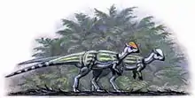 Stegoceras is one of the most completely known North American pachycephalosaurs, and one of the few known from postcranial remains; S. validum specimen UALVP 2 is the most complete Stegoceras individual known to date. Its length is estimated to have been about 2 to 2.5 metres (6.6 to 8.2 ft), comparable to the size of a goat.[26][27][28] The weight has been estimated to be about 10 to 40 kilograms (22 to 88 lb).[29] Stegoceras was small to medium in size compared to other pachycephalosaurs.[3] S. novomexicanum appears to have been smaller than S. validum, but it is disputed whether the known specimens (incomplete skulls) are adults or juveniles.[22][24]