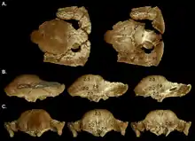 In 2002, Williamson and Carr described a dome (specimen NMMNH P-33983 in the New Mexico Museum of Natural History and Science) from the San Juan Basin, New Mexico, which they considered a juvenile pachycephalosaur of uncertain species (though perhaps Sphaerotholus goodwini). In 2006, Sullivan and Spencer G. Lucas considered it a juvenile S. validum, which would expand the range of the species considerably.[20][21] In 2011, Steven E. Jasinski and Sullivan considered the specimen an adult, and made it the holotype of the new species Stegoceras novomexicanum, with two other specimens (SMP VP-2555 and SMP VP-2790) as paratypes.[22] A 2011 phylogenetic analysis by Watabe and colleagues did not place the two Stegoceras species close to each other.[23] In 2016, Williamson and Stephen L. Brusatte restudied the holotype of S. novomexicanum and found that the paratypes did not belong to the same taxon as the holotype, and that all the involved specimens were juveniles. Furthermore, they were unable to determine whether the holotype specimen represented the distinct species S. novomexicanum, or if it was a juvenile of either S. validum or Sphaerotholus goodwini, or another previously known pachycephalosaur.[24] In 2016, Jasinski and Sullivan defended the validity of S. novomexicanum; they agreed that some features used to diagnose the species were indicative of a sub-adult stage, but presented additional diagnostic features in the holotype that distinguish the species. They also pointed out some adult features, which may indicate heterochrony (difference in timing of ontogenetic changes between related taxa) in the species. They conceded that the paratypes and other assigned specimens differed from the holotype in having more highly domed skulls, instead referring to them as cf. S. novomexicanum (difficult to identify), but found it likely they all belonged to the same taxon (with the assigned specimens being adults), due to the restricted stratigraphic interval and geographic range.[25]
