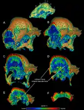 In 2008, Eric Snively and Adam Cox tested the performance of 2D and 3D pachycephalosaur skulls through finite element analysis, and found that they could withstand considerable impact; greater vaulting of the domes allowed for higher forces of impact. They also considered it likely that pachycephalosaur domes were covered in keratin, a strong material that can withstand much energy without being permanently damaged (like the osteoderms of crocodilians), and therefore incorporated keratin into their test formula.[45] In 2011, American palaeontologists Kevin Padian and John R. Horner proposed that "bizarre structures" in dinosaurs in general (including domes, frills, horns, and crests) were primarily used for species recognition, and dismissed other explanations as unsupported by evidence. Among other studies, these authors cited Goodwin et al.'s 2004 paper on pachycephalosaur domes as support of this idea, and they pointed out that such structures did not appear to be sexually dimorphic.[46] In a response to Padian and Horner the same year, Rob J. Knell and Scott D. Sampson argued that species recognition was not unlikely as a secondary function for "bizarre structures" in dinosaurs, but that sexual selection (used in display or combat to compete for mates) was a more likely explanation, due to the high cost of developing them, and because such structures appear to be highly variable within species.[47] In 2013, the British palaeontologists David E. Hone and Darren Naish criticized the "species recognition hypothesis", and argued that no extant animals use such structures primarily for species recognition, and that Padian and Horner had ignored the possibility of mutual sexual selection (where both sexes are ornamented).[48]