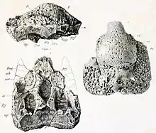 As no similar remains had been found in the area before, Lambe was unsure of what kind of dinosaur they were, and whether they represented one species or more; he suggested the domes were "prenasals" situated before the nasal bones on the midline of the head, and noted their similarity to the nasal horn-core of a Triceratops specimen.[1] In 1903, Hungarian palaeontologist Franz Nopcsa von Felső-Szilvás suggested that the fragmentary domes of Stegoceras were in fact frontal and nasal bones, and that the animal would therefore have had a single, unpaired horn. Lambe was sympathetic to this idea of a new type of "unicorn dinosaur" in a 1903 review of Nopscsa's paper. At this time, there was still uncertainty over which group of dinosaur Stegoceras belonged to, with both ceratopsians (horned dinosaurs) and stegosaurs (plated dinosaurs) as contenders.[5][6] Hatcher doubted whether the Stegoceras specimens belonged to the same species and whether they were dinosaurs at all, and suggested the domes consisted of the frontal, occipital, and parietal bones of the skull.[2] In 1918, Lambe referred another dome (CMN 138) to S. validus, and named a new species, S. brevis, based on specimen CMN 1423 (which he originally included in S. validus). By this time, he considered these animals as members of Stegosauria (then composed of both families of armoured dinosaurs, Stegosauridae and Ankylosauridae), in a new family he called Psalisauridae (named for the vaulted or dome-shaped skull roof).[7]