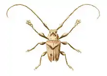 General colour grey brown. Head furnished with strong mandibles. Antennae (with the basal joint very thick) much longer than the insect. Thorax rough, gibbous, and full of small pustules, two of which form an obtuse spine on the sides. Scutellum small and triangular. Elytra margined, and full of small pustules, having two spines fixed at their extremity, near the suture. Forelegs long. Tibiae with a single spur. Femora clavate. Body length about 1 inch (25 mm).[2]