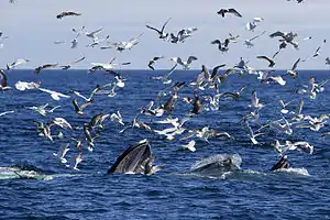 The steep sides of the plateau cause deep-water currents to rise up when they hit the bank; this upwelling brings with it nutrients and minerals from the bottom, feeding the local ecosystem. Over 130 species from numerous classes of the animal kingdom call the bank home at least temporarily. Some such fish are the Atlantic cod, silver hake, yellow-tail flounder, blue-fin and yellow-fin tuna, striped bass, blue fish and numerous species of shark including the great white shark.[1] Shellfish such as the American lobster, sea scallops, squid and ocean quahogs are also prevalent. Many marine birds call the bank home including gannets, shearwaters, storm petrels, fulmars, puffins and razorbills. Reptiles are even present, primarily being represented by the leatherback sea turtle. Possibly the most famous animals on Stellwagen Bank are the mammals. Five species of seals (harp seal, gray seal, harbor seal, hooded seal, and ringed seal), and numerous whale species swim in the waters of Stellwagen.[2] Whale watchers can frequently see humpback whales, minke whales and fin whales. There are occasional sightings of one of the most critically endangered whale species, North Atlantic right whale. Several other whale species can also be seen here including the sperm whale, beluga, orca, pilot whale, White-beaked dolphin, Atlantic white-sided dolphin, common dolphin, bottlenose dolphin, Risso’s dolphin, harbor porpoise, blue whale, and sei whale.[2]