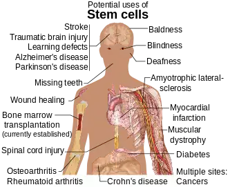 Stem-cell therapy is the use of stem cells to treat or prevent a disease or condition.[1] As of 2016, the only established therapy using stem cells is hematopoietic stem cell transplantation.[2] This usually takes the form of a bone-marrow transplantation, but the cells can also be derived from umbilical cord blood. Research is underway to develop various sources for stem cells as well as to apply stem-cell treatments for neurodegenerative diseases[3] and conditions such as diabetes and heart disease.