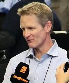 Stephen Douglas Kerr (born September 27, 1965) is an American professional basketball coach and former player who is the head coach of the Golden State Warriors of the National Basketball Association (NBA).[1] He is an eight-time NBA champion, having won five titles as a player (three with the Chicago Bulls and two with the San Antonio Spurs) as well as three with the Warriors as a head coach. Kerr has the highest career three-point field goal percentage (45.4%) in NBA history for any player with at least 250 three-pointers made. He also held the NBA record for highest three-point percentage in a season at 52.4% until the record was broken by Kyle Korver in 2010.