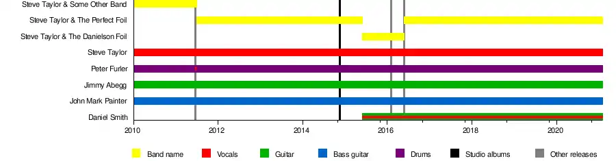 Steve Taylor & The Perfect Foil is an American alternative rock supergroup formed in 2010 by singer Steve Taylor with drummer Peter Furler (Newsboys, Peter Furler Band), guitarist Jimmy Abegg (Vector, A Ragamuffin Band), and bassist John Mark Painter (Fleming and John). Taylor formerly saw success as a new wave singer during the 1980s and early 1990s, and also fronted the short-lived band Chagall Guevara. However, by the mid-1990s he abandoned performing music and transitioned into work as a record producer, songwriter, and film-maker. In 2010 Taylor, who was frustrated at the slow pace of his fundraiser for his feature film Blue Like Jazz, collaborated with Furler, Abegg, and Painter to record the song "A Life Preserved" for the film's soundtrack, and began recording other material. Taylor, Abegg, and Painter then featured on the Peter Furler song "Closer", under the name "Steve Taylor & Some Other Band", on Furler's album On Fire. With those collaborations as a starting point, Taylor relaunched his career as a performing musician, and the lineup was branded as Steve Taylor & The Perfect Foil. The group released a studio album entitled Goliath on November 18, 2014 to critical acclaim and modest commercial success. In 2015, Daniel Smith of Danielson, with whom the band had been touring, joined on in a collaboration touted as Steve Taylor & The Danielson Foil. Under this incarnation, the group released the EP Wow to the Deadness on February 5, 2016, and toured until February 12. A live album under this incarnation of the band was also released, and the band also contributed to the soundtrack for the 2020 film Electric Jesus.