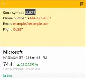 ![]() Screenshot of Sticky Notes on Windows 10 with insight enabled. The upper half with a yellow background is the typed note. Red text indicates an insight has been identified. The white with black highlight is the selected text for the insight shown in the lower portion of the sticky note. | |