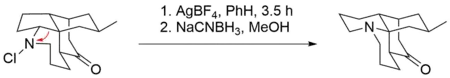 However, there also have been reported examples of base-free Stieglitz rearrangements of N-halogenated amines. An example for that can be found in the total synthesis of (±)-lycopodine by Paul Grieco et al.[6][29] There, a ring formation takes place by a rearrangement on a secondary haloamine by subjecting it to silver tetrafluoroborate.[6] AgBF4 is known to act as a source of Ag+-ions that can facilitate the dissociation of halides from organic molecules, with the formation of the respective silver halide as a driving force.[30] The desired product is then obtained by reduction with sodium cyanoborohydride, a mild reducing agent which is commonly employed in the reduction of imines to amines.[31]