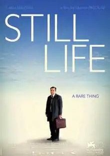 Still Life is a 2013 drama film written and directed by Uberto Pasolini.[1][2] The film was presented at the 70th Venice Film Festival , where it won the award for Best Director in the category "Orizzonti".[3] At the Reykjavik International Film Festival, Still Life received the top award (Golden Puffin) as well as the FIPRESCI Award.[4] It also received the Black Pearl award (the highest award) at the Abu Dhabi Film Festival for "its humanity, empathy, and grace in treating grief, solitude, and death"; and for his performance, Eddie Marsan won the Best British Actor award at the 2014 Edinburgh International Film Festival.[5]