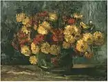 Flowers were the subject of many of Van Gogh's paintings in Paris, due in great part to his regard for flowers. Knowing Van Gogh's interest in making still life paintings of flowers, friends and acquaintances in Paris sent bouquets of flowers weekly for his paintings.[32] He also purchased inexpensive bouquets himself, choosing flowers in a variety of types and colors for his paintings.[33] Many of his still life paintings of flowers reflect a sense of overabundance of European still lifes, where blossoms fill the canvas, blooms spill out of the vase or stems of flowers teeter on the edge of the vase.[34]