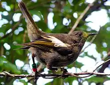 The stitchbird nests in cavities high up in old trees.[8] They are the only bird species that mates face to face,[9] in comparison to the more conventional copulation style for birds where the male mounts the female's back.[10] Stitchbird have some of the highest levels of extra-pair paternity of any bird with up to 79% of the chicks in the nest sired by other males, possibly as a result of forced copulations.[11]