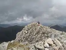 ![]() Stob Coire Sgreamhach (peak left of centre) seen from Coire Gabhail, with the red scree of Bealach Dearg at the low point of the ridge | |