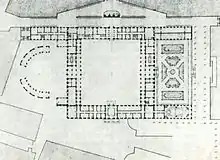 According to a plan from before the fire, the palace was to be in a square shape without any wings in austere Roman Baroque style, essentially with the rest of the rows looking like the northern row. This suggestion is not preserved, historian Boo von Malmborg suggests that this was probably because Tessin did not dare to present his comprehensive plans to the economical Charles XI.[9]